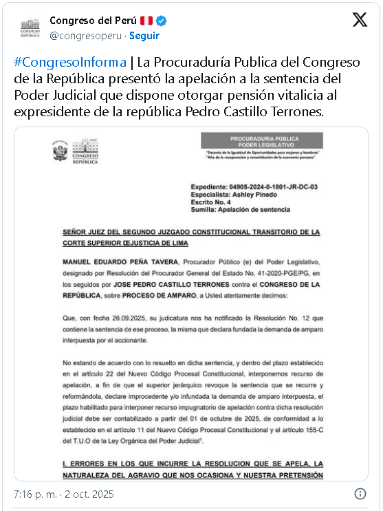 Procuraduría del Congreso presenta apelación contra fallo que concede pensión vitalicia a Castillo